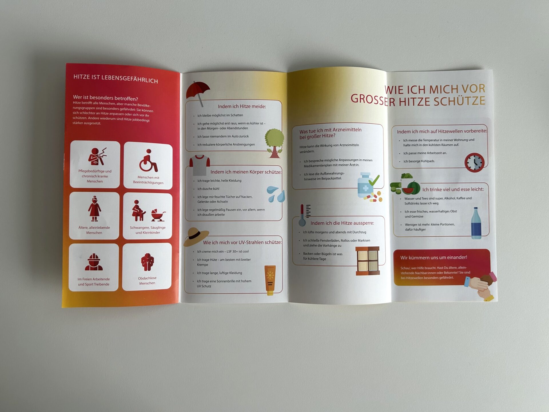 Flyer mit Informationen und Hinweisen zum richtigen Verhalten bei Hitze zur Weitergabe an Patienten.