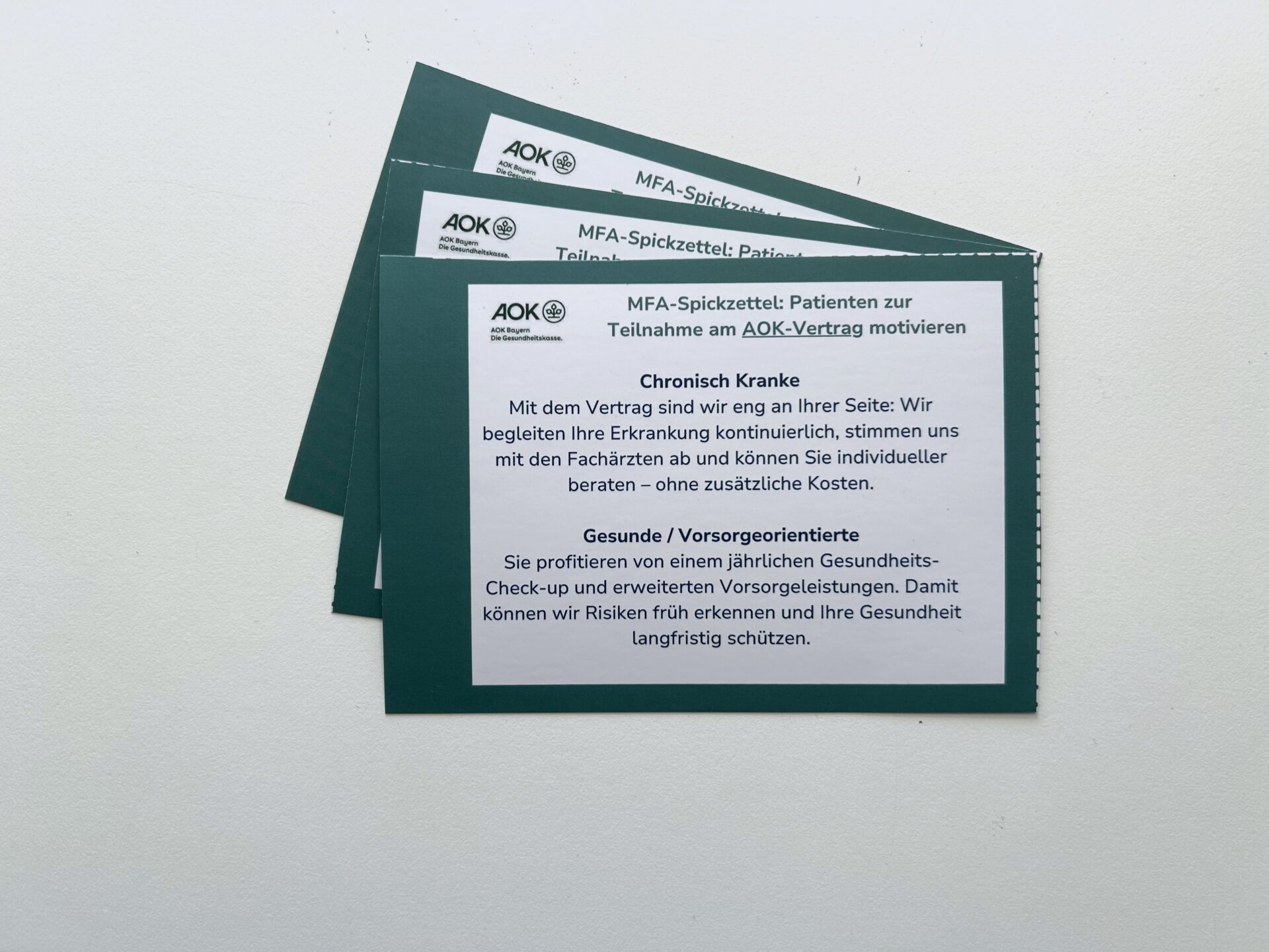 Kompakter Spickzettel zur gezielten Ansprache und Motivation von Patienten zur Teilnahme am AOK-Vertrag.